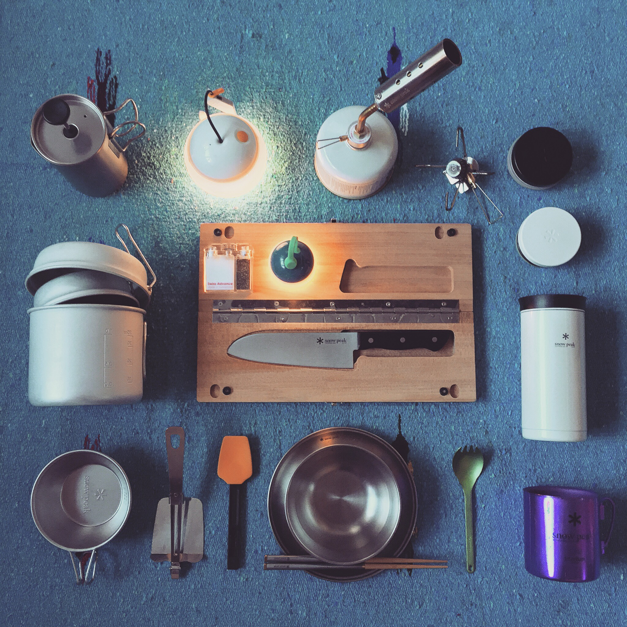 • Any camping gear from Snow Peak – The essentials are the chopping board, folding table, French press, Camp stove and Kanpai Bottle.
