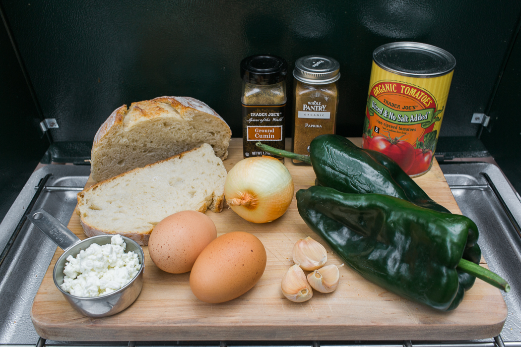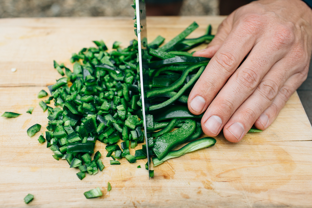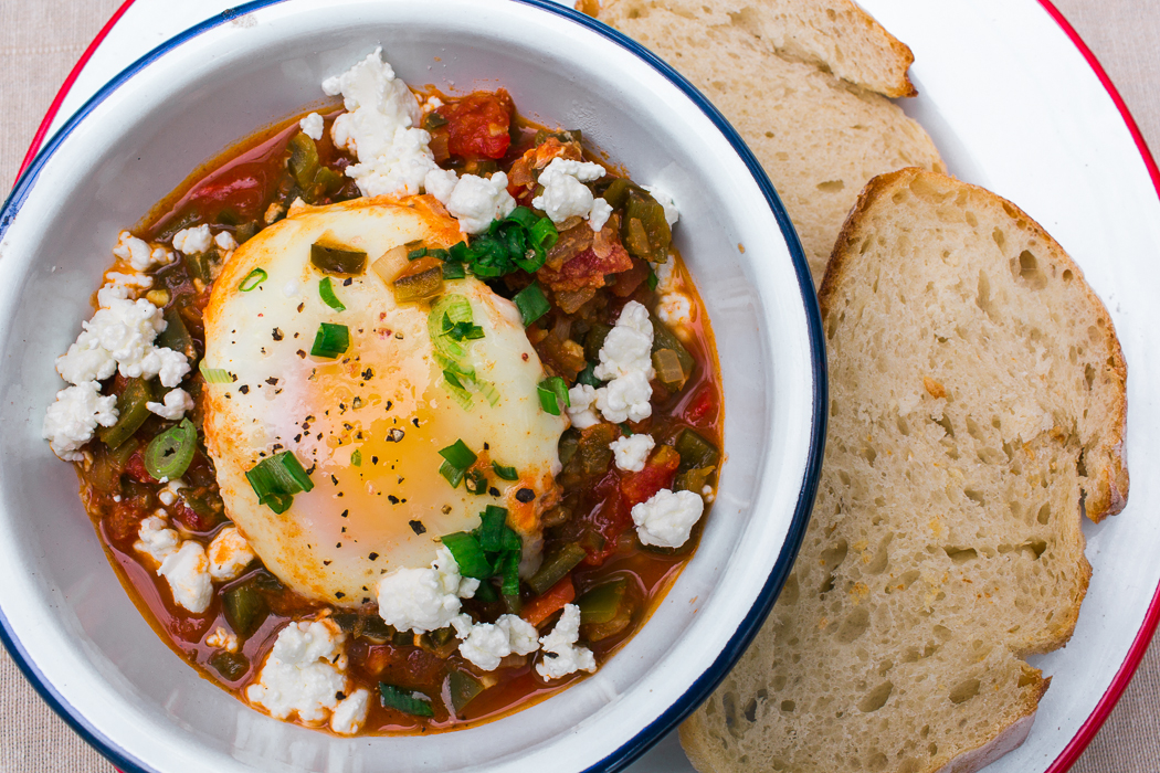 This meal is great for both breakfast and dinner. The number of eggs you use depends on the size of your pot, as well as your desired serving size. I’d recommend at least one egg per person for breakfast, or two eggs per person for dinner. Take care when cracking the eggs directly into the sauce – the shells are a pain to try to pick out. If you prefer, crack each egg into a bowl and then slip them into the sauce one by one. We chose to use poblano peppers in our version, because they are pretty middle of the road in terms of heat. If you want a milder shakshuka, you can use red bell peppers. If you’re a fan of spicier food, you could use (or add) a jalapeno or two.