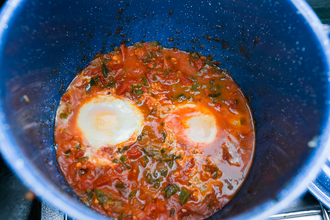 Shakshuka (pronounced shahk-SHOO-kah, for inquiring minds) is one of those dishes of which many cultures have their own variation (Mexico’s huevos rancheros, Italy’s eggs in purgatory, and Andalusia’s huevos flamenca are dishes reminiscent of shakshuka), and nearly every North African and Middle Eastern country to this day insist that shakshuka is “theirs.” While it seems that Tunisia is likely the originator of this dish, it also appears that Libya, Yemen, Morocco, Algeria, Egypt, and Israel all want to stake their claim on shakshuka as well. It makes sense: this dish is cheap, easy, hearty, and above all: delicious. All reasons as to why shakshuka is an excellent camping meal as well.